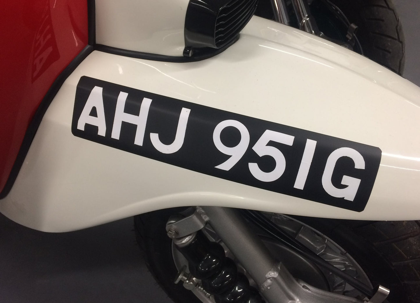 Front number plate straight set. As per the original 1960's design in black and white self adhesive. Contact us via email ( daskill@hotmail.co.uk ) with your registration details and we will send them out to you ready to peel back and stick to your mudguard!.