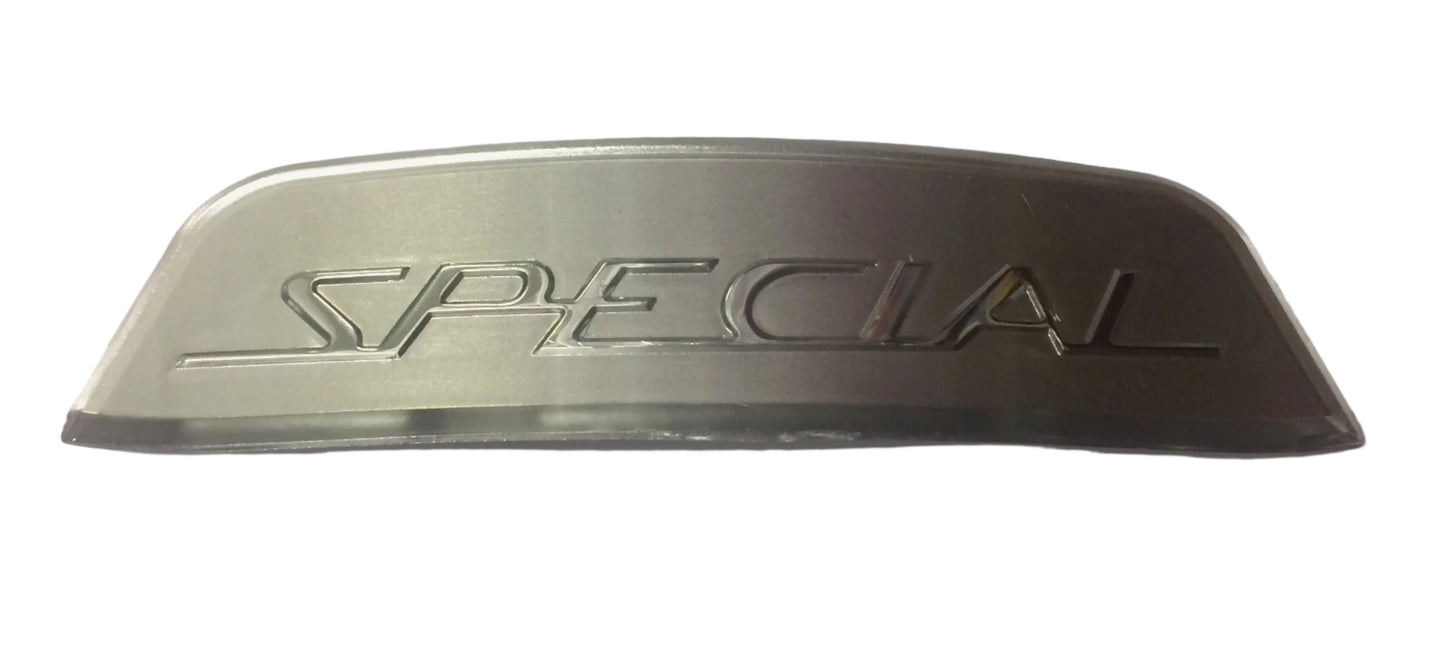 Top quality Lambretta silver "Special" shaped rear frame badge.