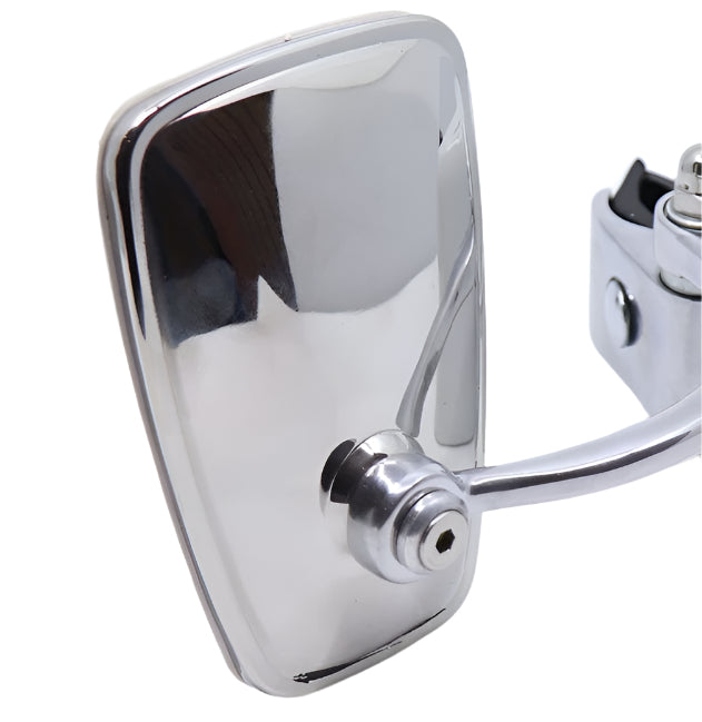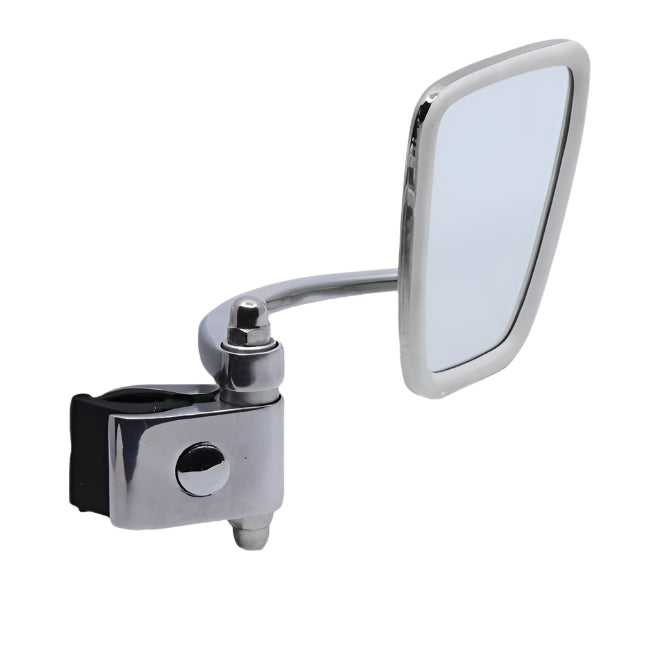 Legshield fold out mirror (Stadium style). Right hand side with mirror arm up (can be fitted either side). Stainless steel head with polished alloy body and arm.
