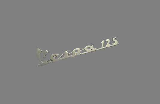 Vespa 125 script badge in bright alloy with 3 pins spaced 130mm.