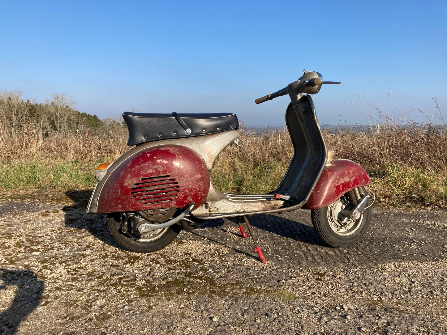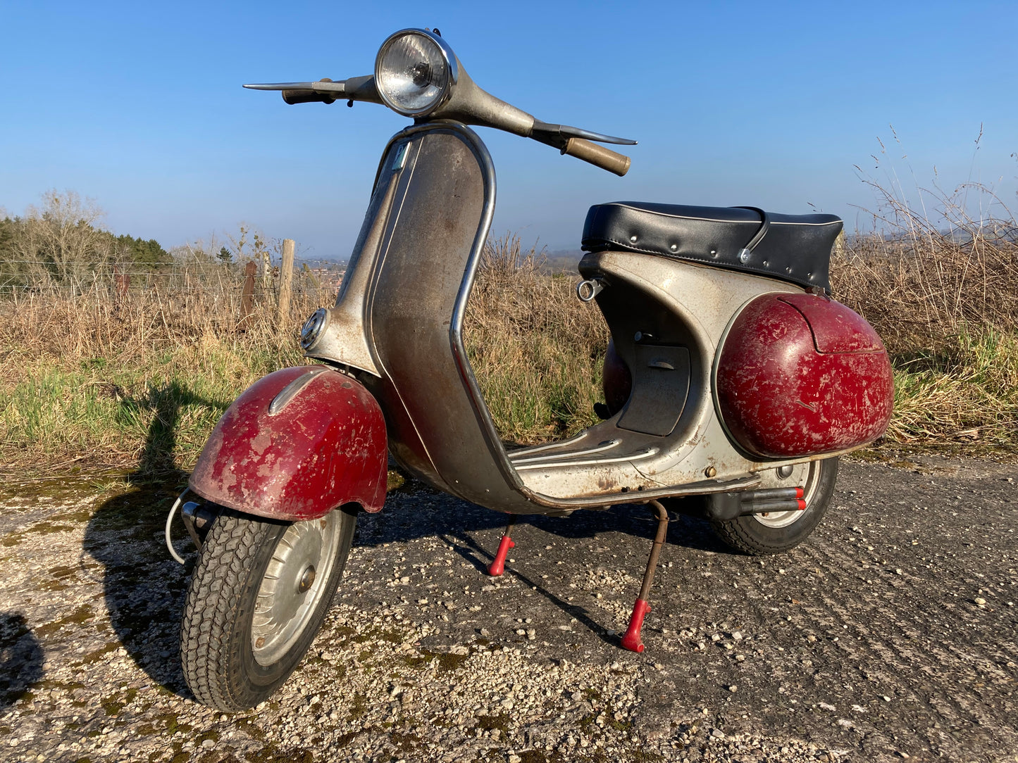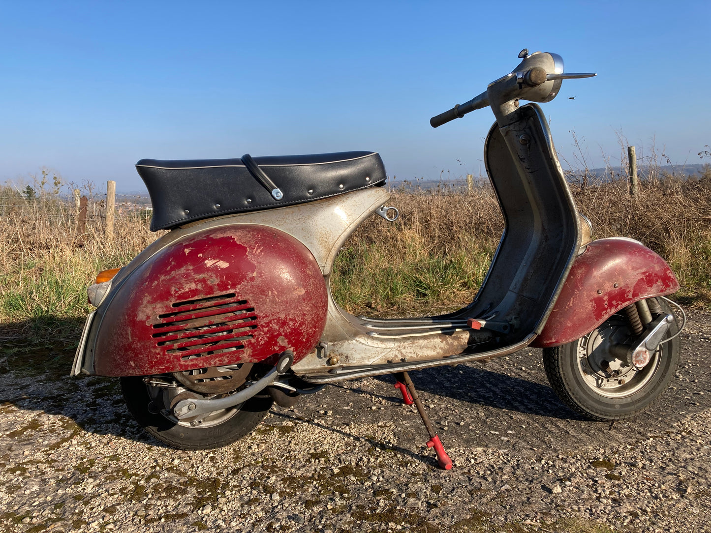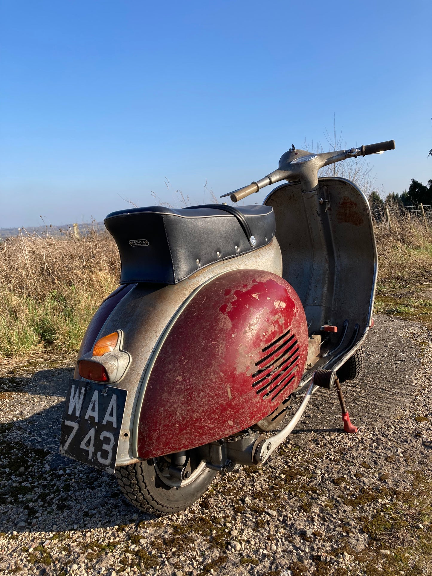 I came across this totally solid original paint GS150 a couple of years back. A previous owner had stripped the scooter down to parts to repaint and restore it. Luckily I thought the restoration had been abandoned ! Our team carefully cleaned and conserved all the original parts and sympathetically added new parts where required to achieve a "barn fresh" look. The red panels and mudguard were customising of the style when the machine was new so we stuck with that look and it suites it well we think. The scooter is mechanically completely overhauled and runs and sounds sweet. It does still need putting back on DVLA system but I do have a Council record from Hampshire ( June 1959 ) recording it's original county registration so the number plate WAA 743 should be retained. Your chance to put your hands on one of the few original condition GS150 machines supplied new by Douglas of Bristol.