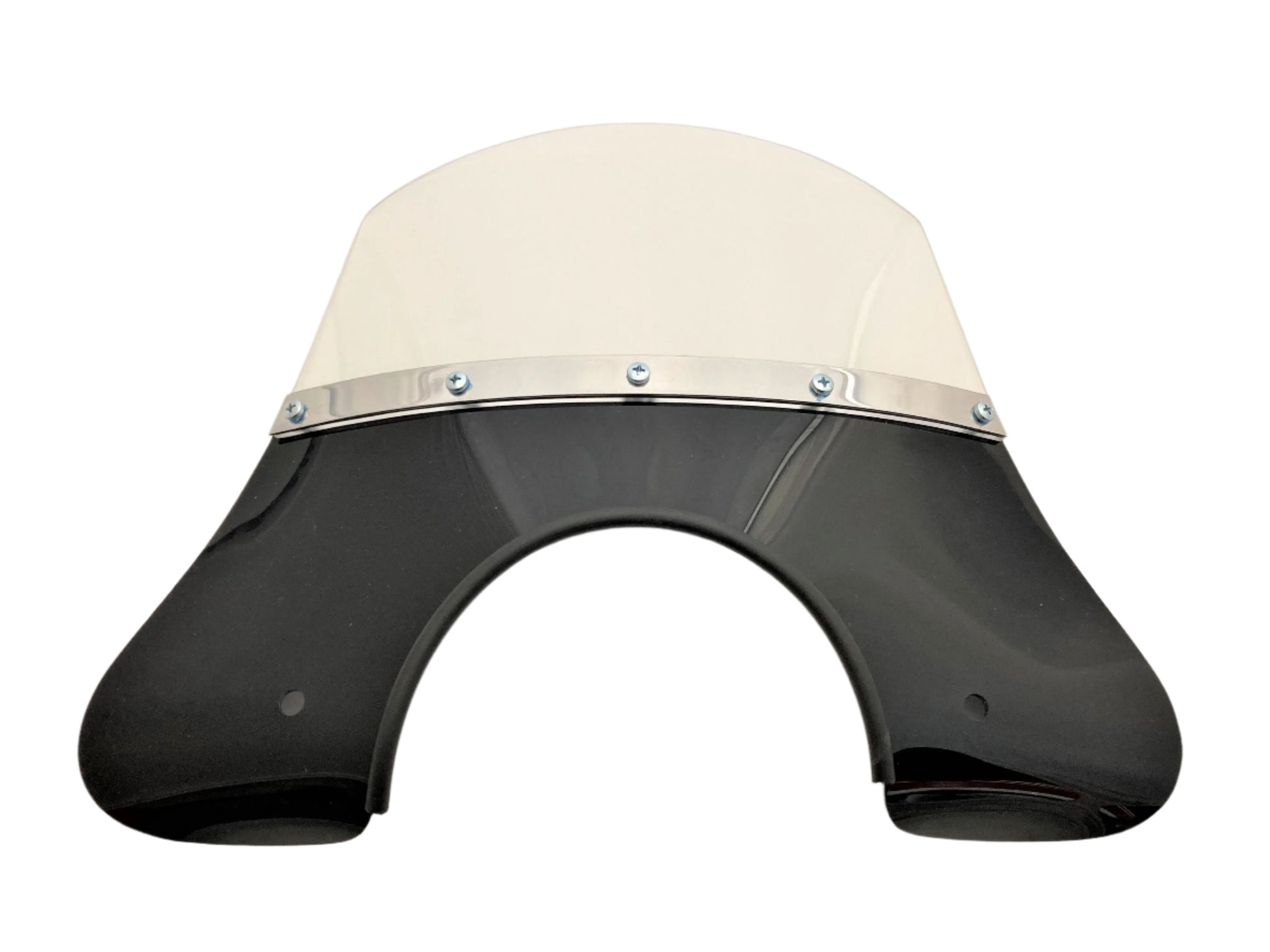 Vespa PX models fly screen in BLACK , clear top and stainless steel centre strip. Supplied with complete set of fittings. Made in Italy by CUPPINI